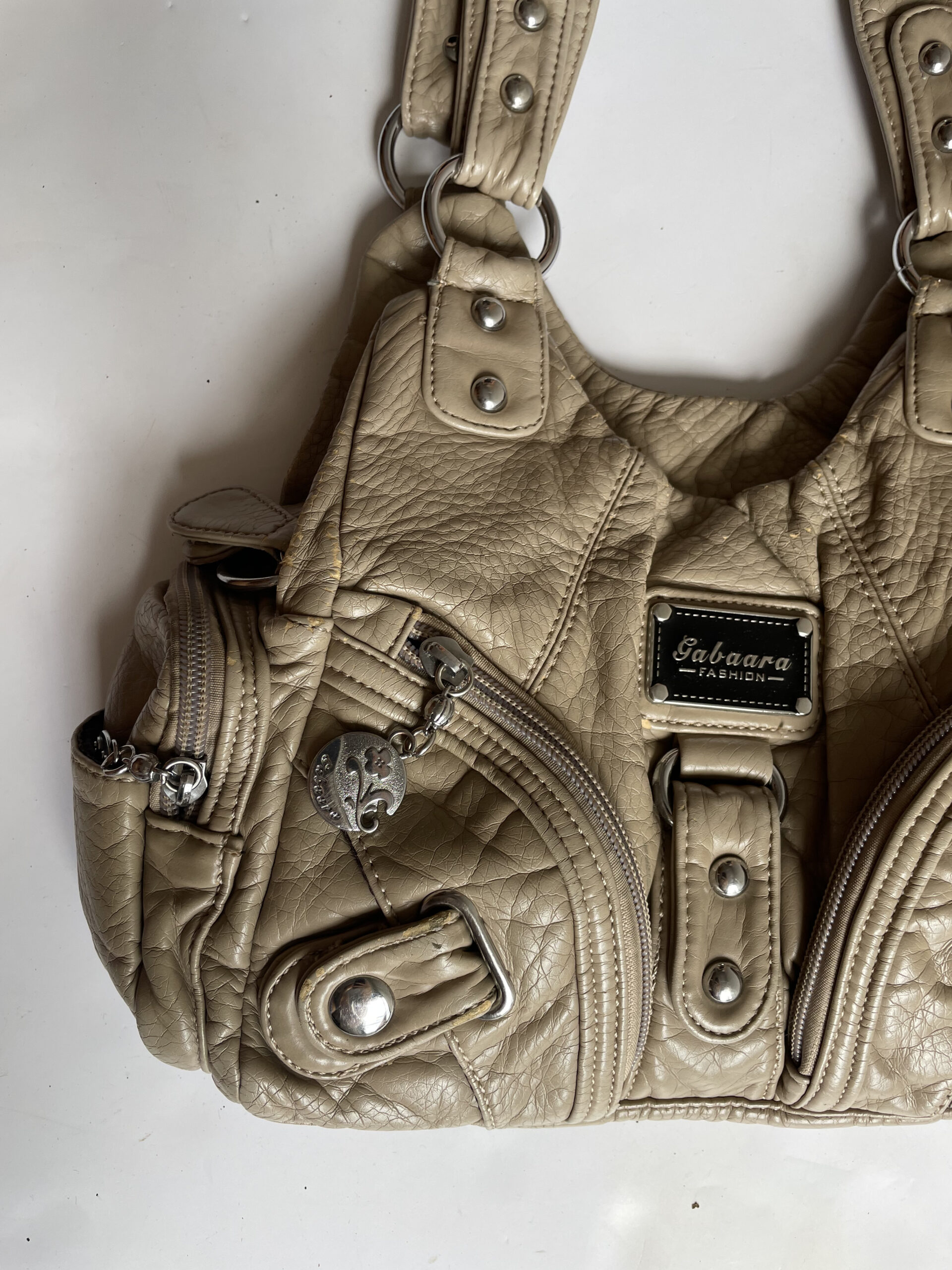 A beige leather city bag with zipper accents, medium size, and ample capacity is a versatile and stylish accessory that combines functionality with a chic design, making it an excellent choice for both everyday use and special occasions.