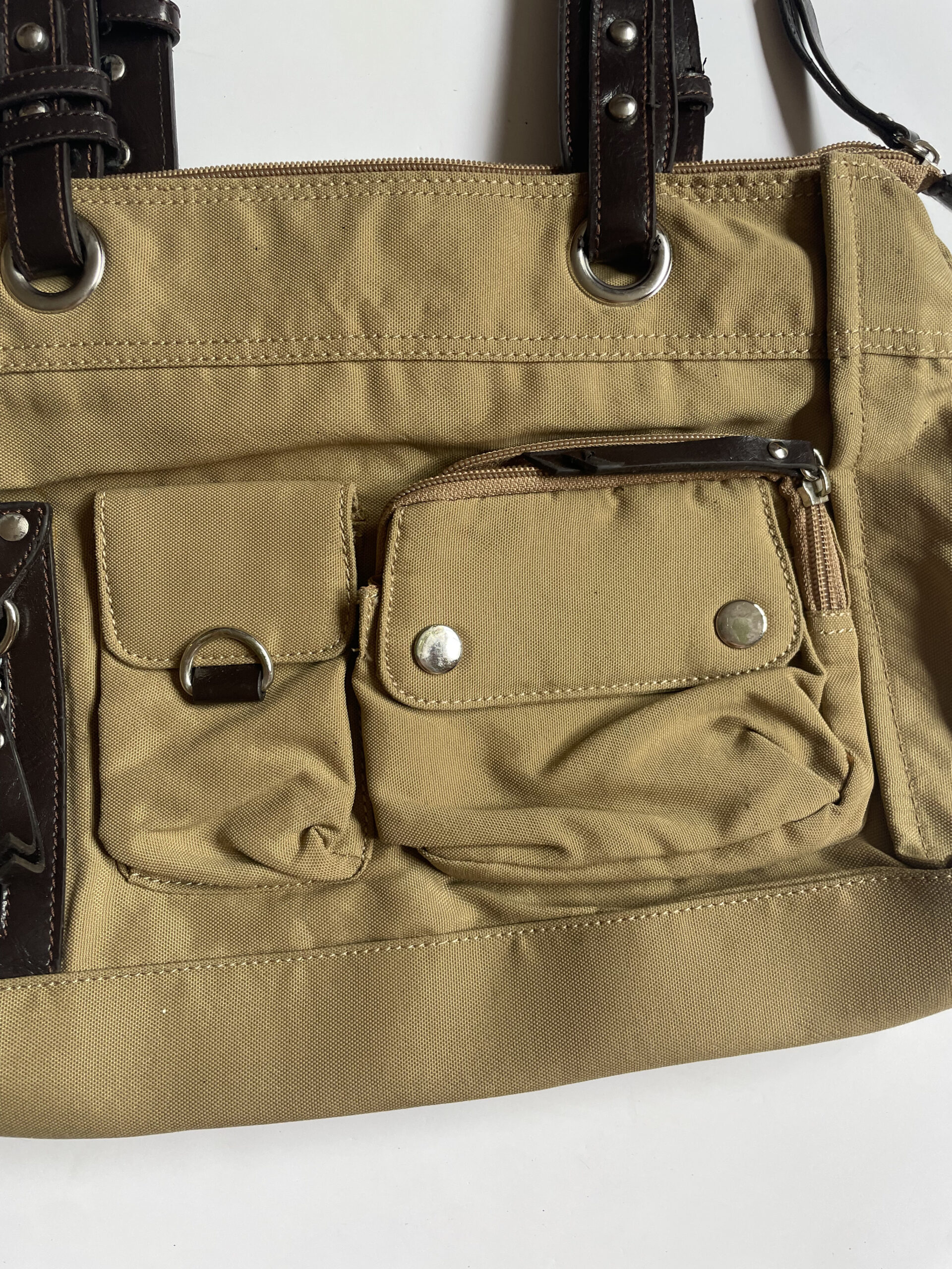 A beige cargo city bag featuring multiple pockets and leather contrasting accents, blending utility with a touch of sophistication for a stylish and functional accessory.