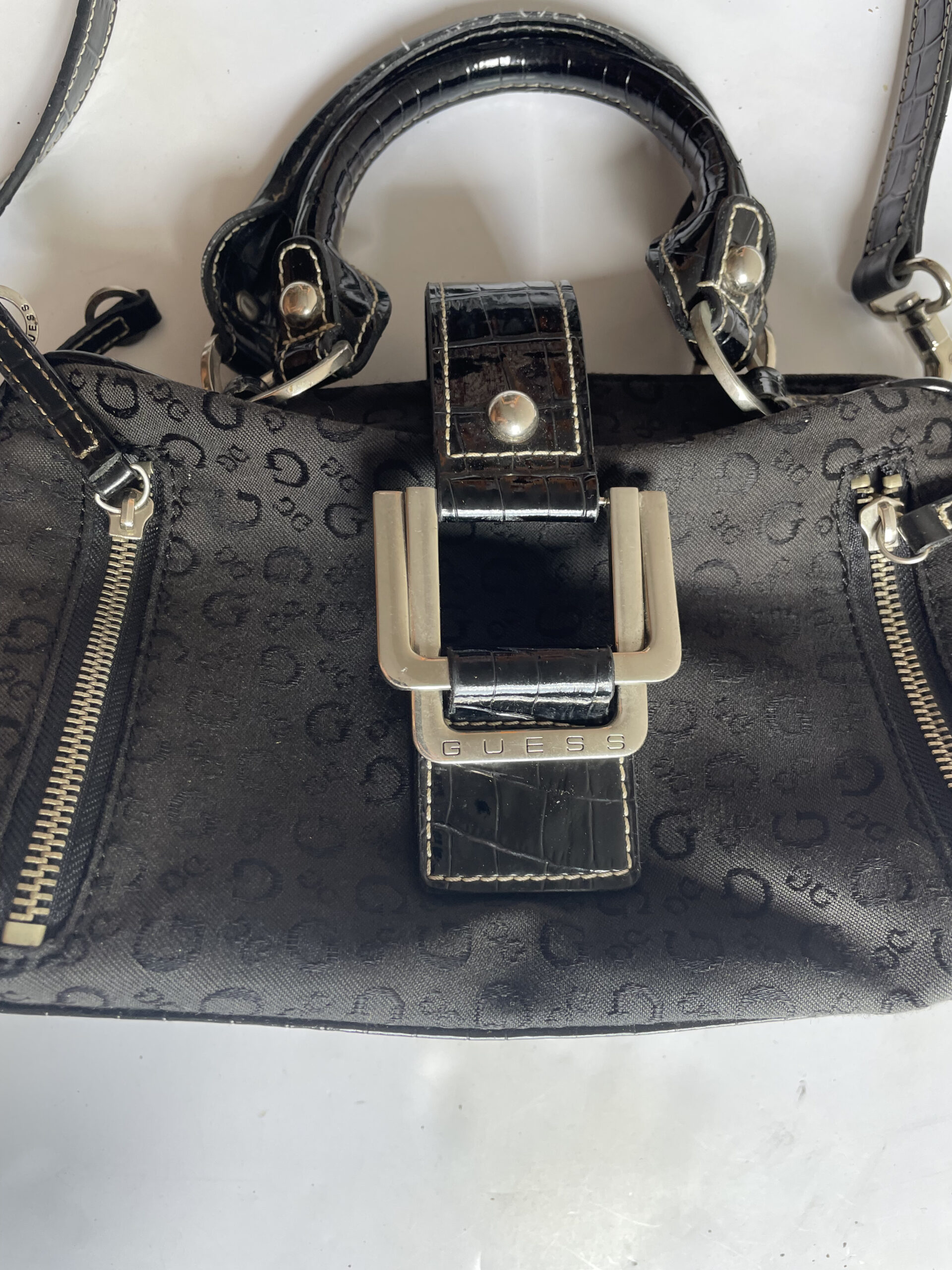 An early 2000s Guess bowling shoulder bag featuring a captivating combination of buckles and snakeskin texture, embodying a fusion of trendy style and edgy details that make a bold fashion statement.