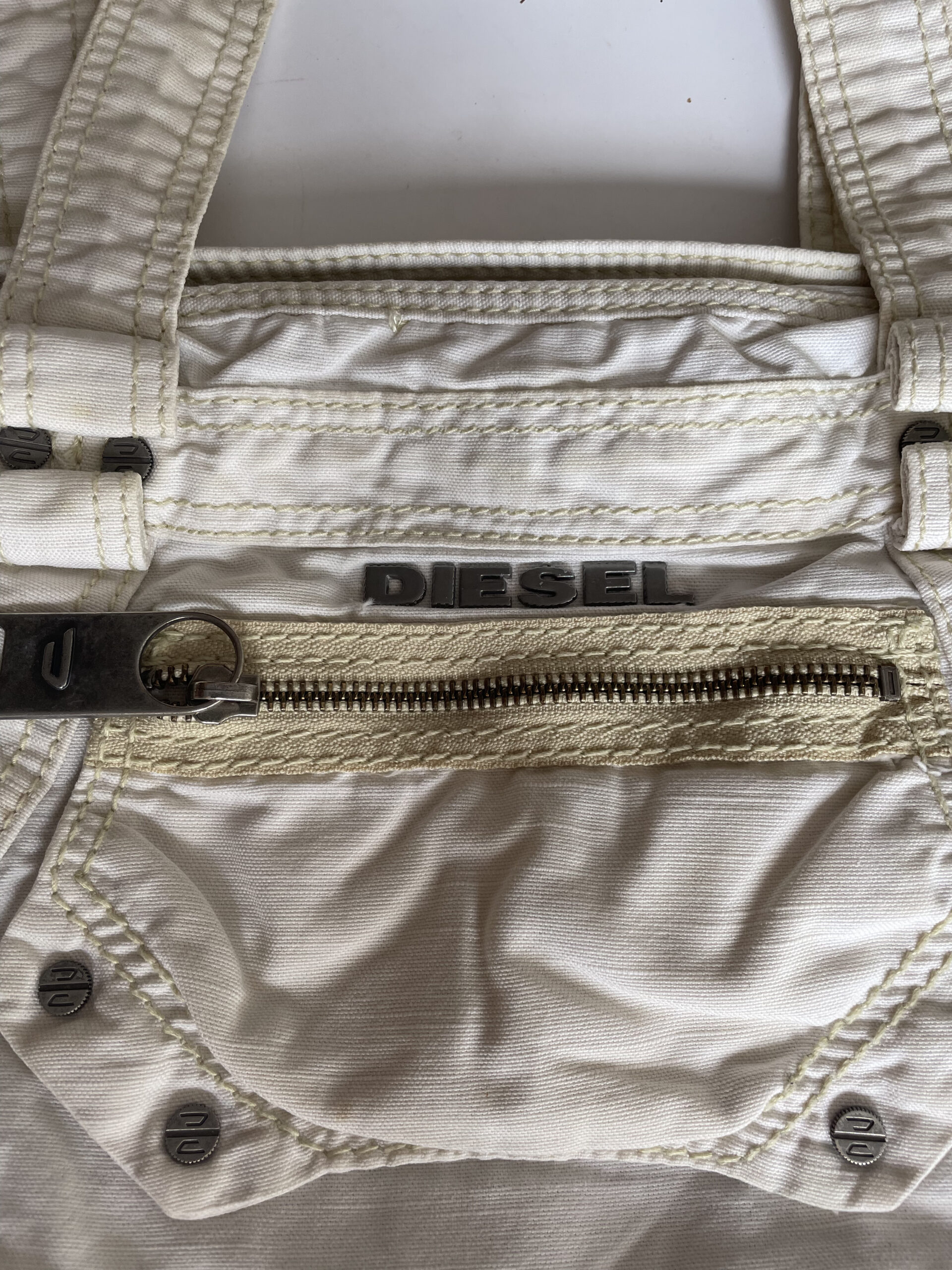 A Diesel city bag in white canvas with pockets is a stylish and practical accessory that combines a clean and versatile white canvas design with functional pockets, offering both fashion and convenience for your everyday use.
