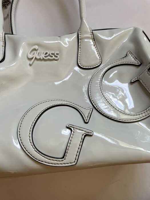 A Guess white handbag with a patent effect is a fashionable accessory characterized by its glossy and shiny finish. This sleek design typically showcases the iconic Guess logo and offers a versatile and stylish option for completing various outfits, adding a touch of sophistication to your ensemble.