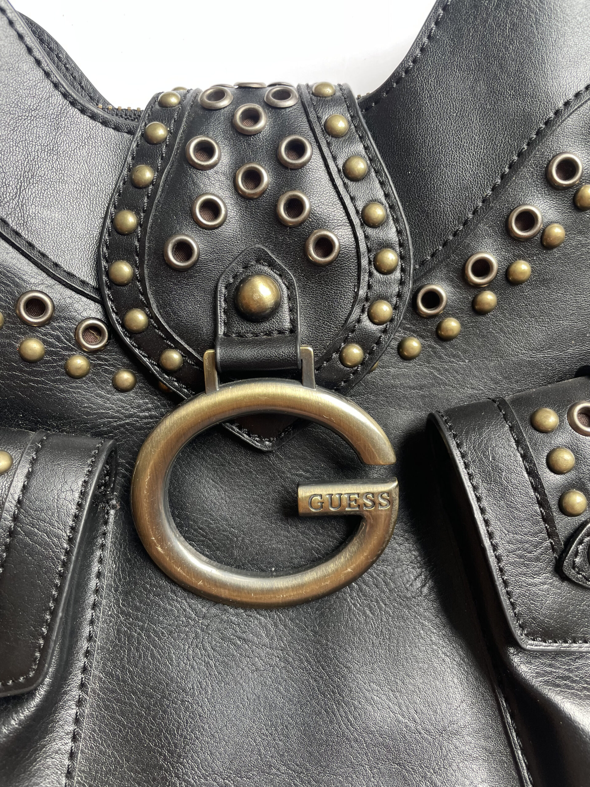 A Guess studded shoulder bag is a stylish and edgy accessory adorned with studs, perfect for adding a touch of boldness and fashion-forward flair to your ensemble. The desirable handbag worn by the iconic Gabriela Flores.