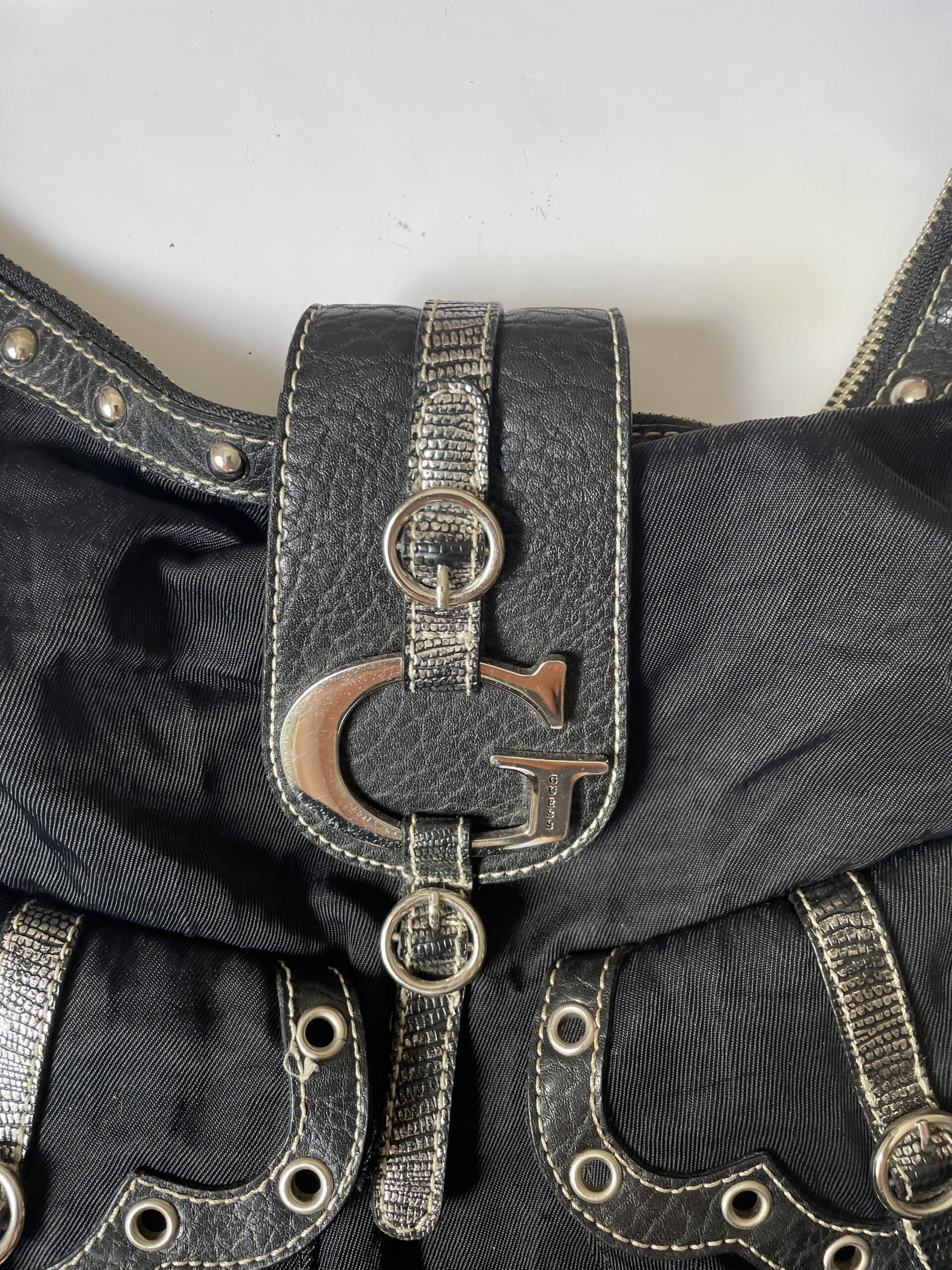 The black Guess canvas tote features a leather studded strap adorned with a buckle that says «Guess.» This stylish bag combines canvas and leather materials, making it a fashionable and functional accessory perfect for carrying your essentials with a trendy flair.