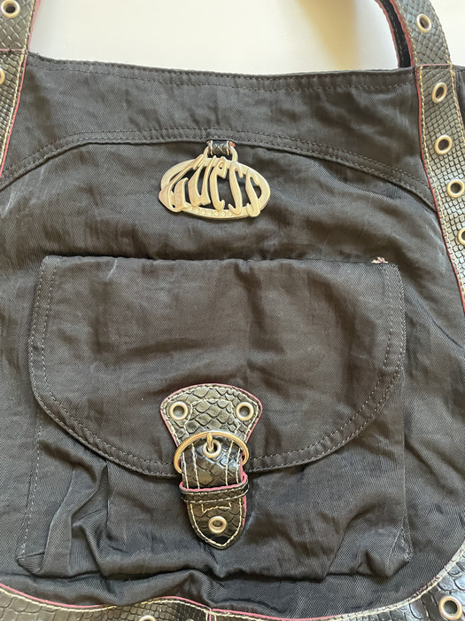 A Guess shoulder bag tote in black with studs and a silver metal buckle is a fashionable and edgy accessory. The combination of black with silver accents and studs adds a touch of sophistication and rebellious style to the bag’s design, making it a statement piece in your ensemble.