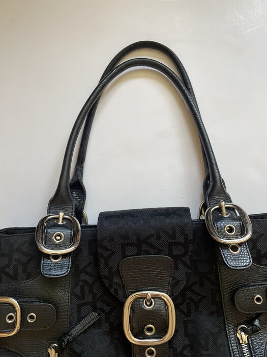 The black DKNY tote bag with silver details is a sleek and sophisticated accessory designed by DKNY. It typically boasts a black color with silver hardware accents, offering a versatile and chic option for carrying your essentials with a touch of modern elegance.