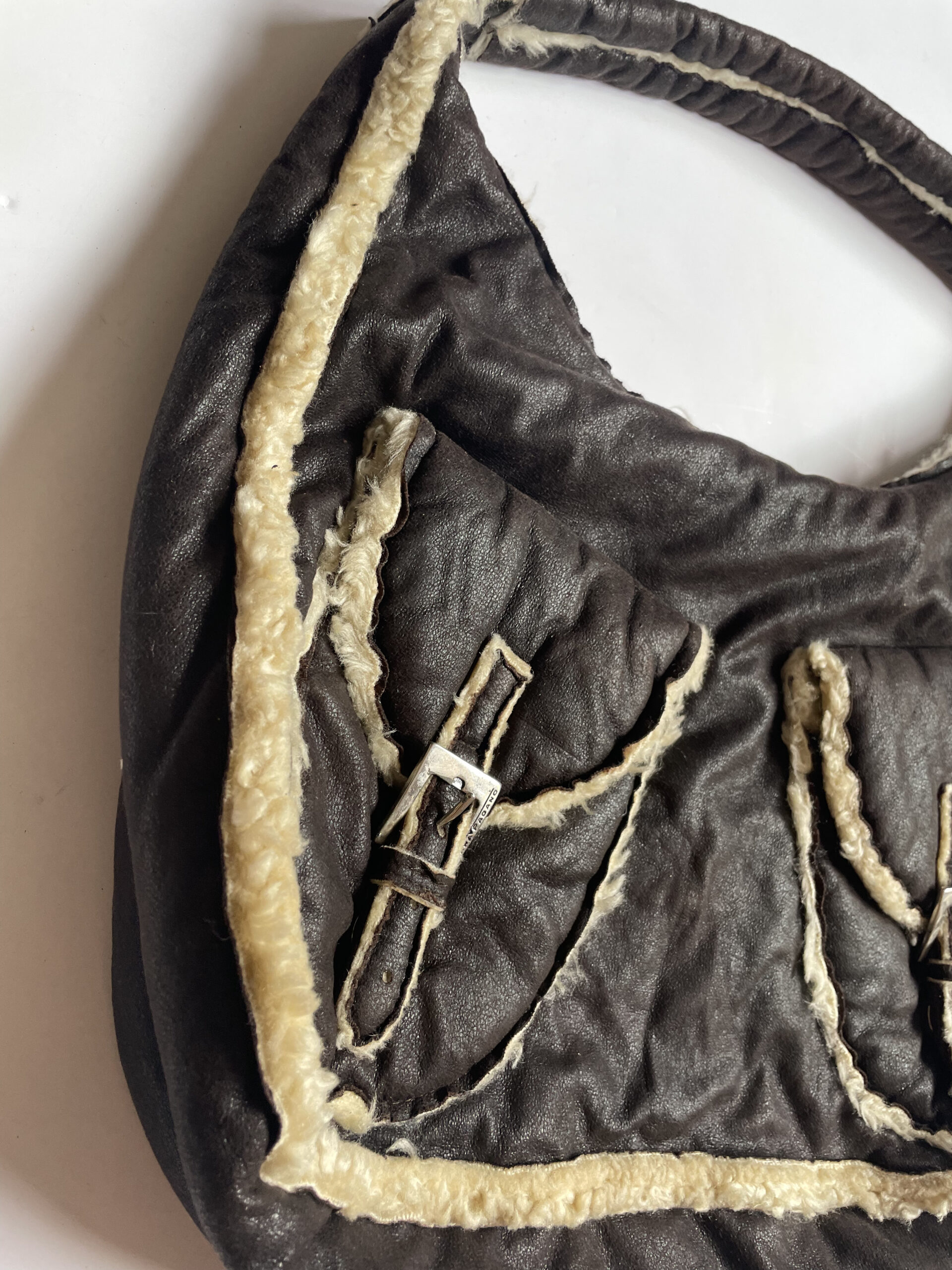 A chocolate brown leather tote bag with cozy sheepskin contrast accents, boasting two convenient pockets and a luxurious sheepskin inner lining for a perfect blend of style and practicality.