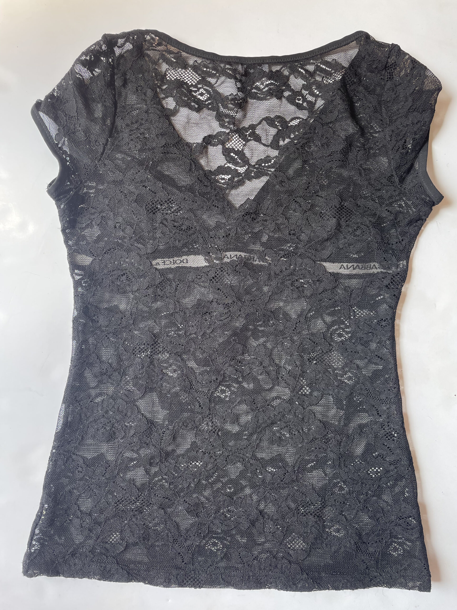 A Dolce & Gabbana sheer lace top is a luxurious and sophisticated fashion piece. Sheer lace adds an element of sensuality and elegance to the top’s design, making it suitable for a variety of formal or upscale occasions when paired with the right outfit.