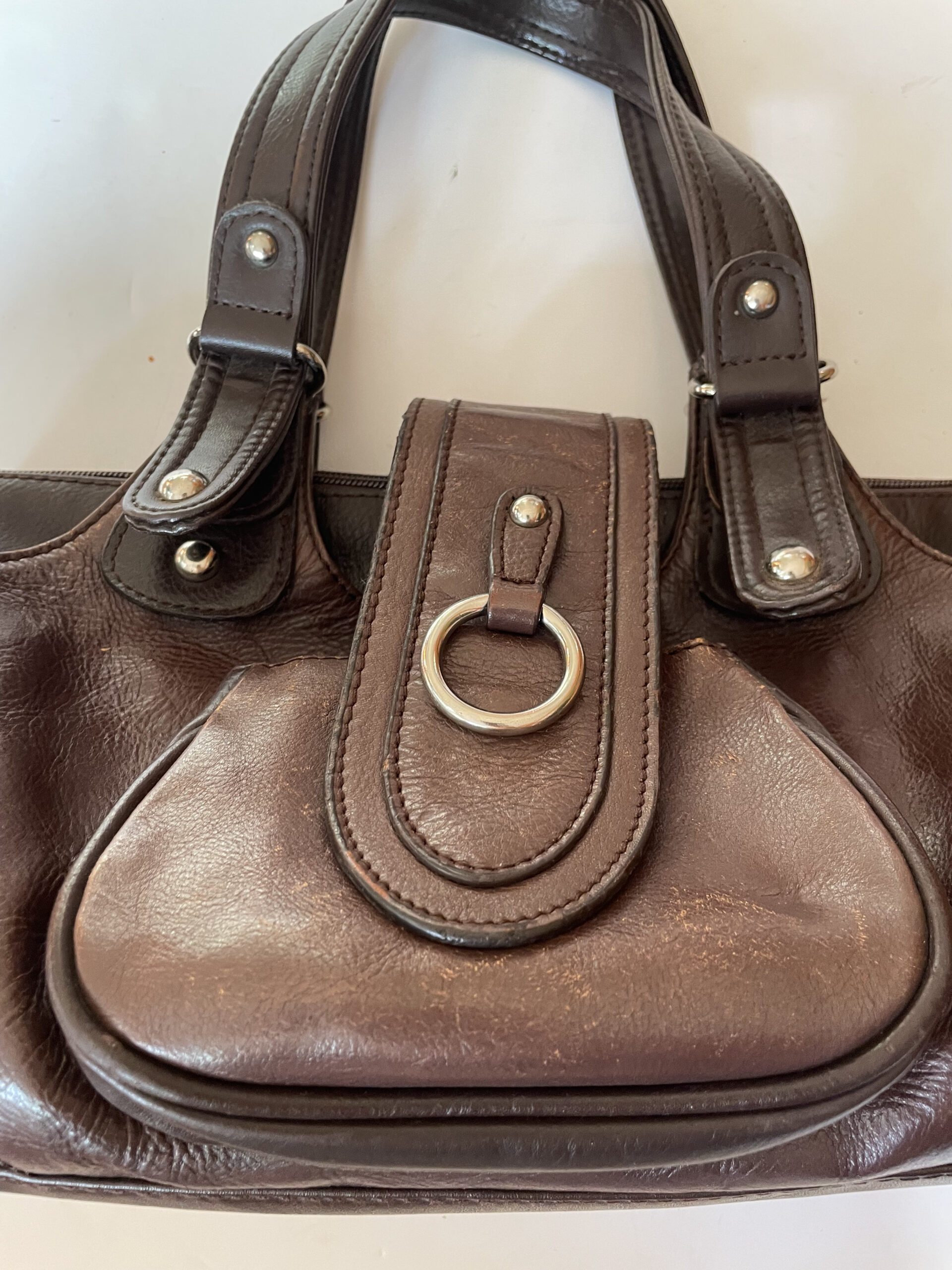 A brown leather shoulder bag with pockets, offering a stylish and practical accessory with a touch of sophistication.